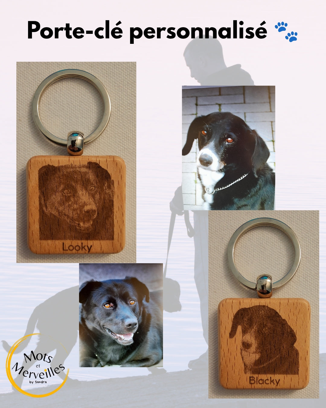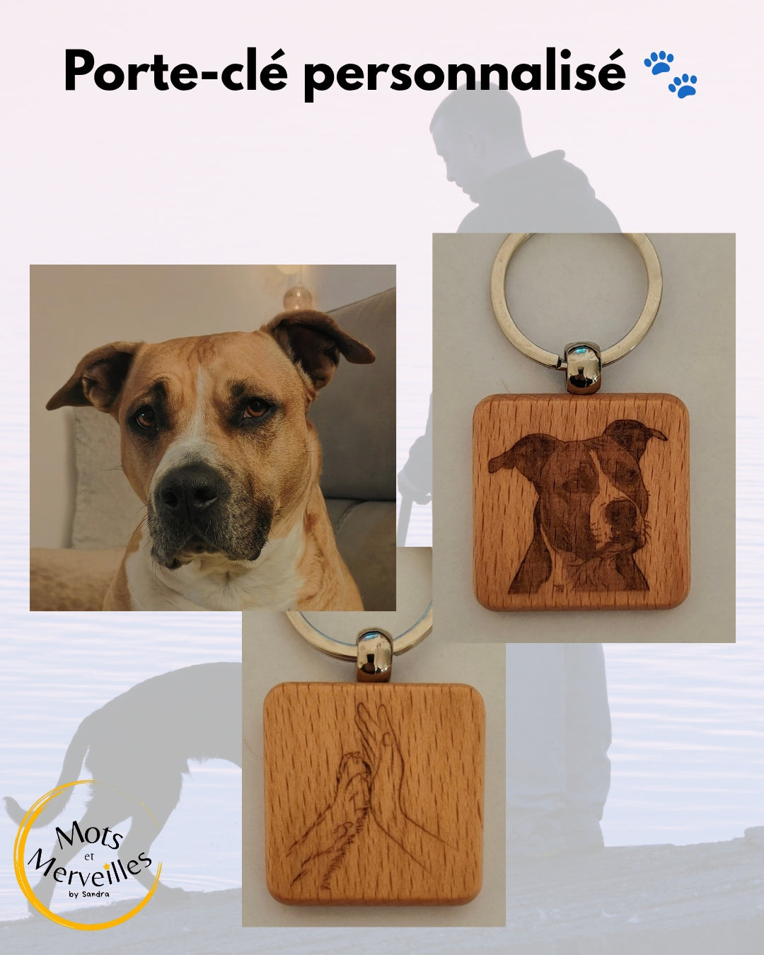 - la photo de votre animal avec le nom en option d'un côté et de l'autre côté une main d'humain et une patte de chien