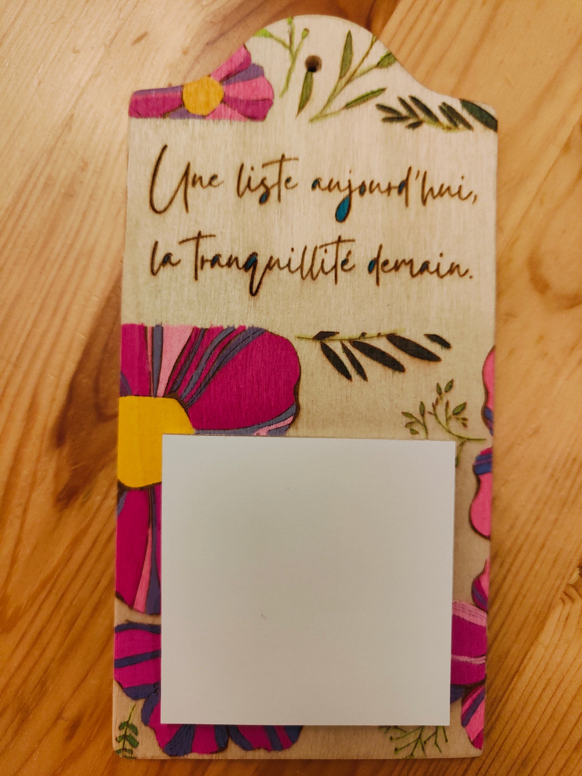 Support en bois mural avec post-it pour pouvoir écrire ses pensées ou sa liste de courses.
